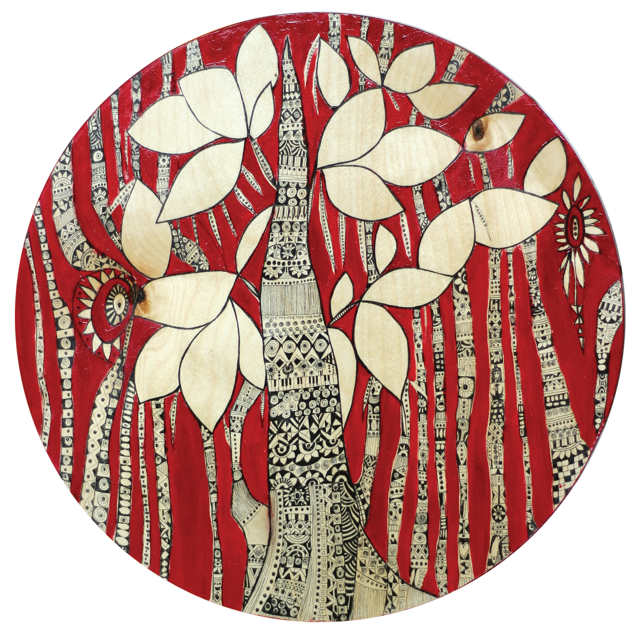 Интересна работа с изображением древа. На красно-терракотовом фоне по центру – ствол дерева, испещренный мелким графическим рисунком. Раскидистые крупные листья и лианы, ниспадающие словно водопад, заполняют все свободное пространство картины и словно переносят нас в экзотичный мир джунглей.