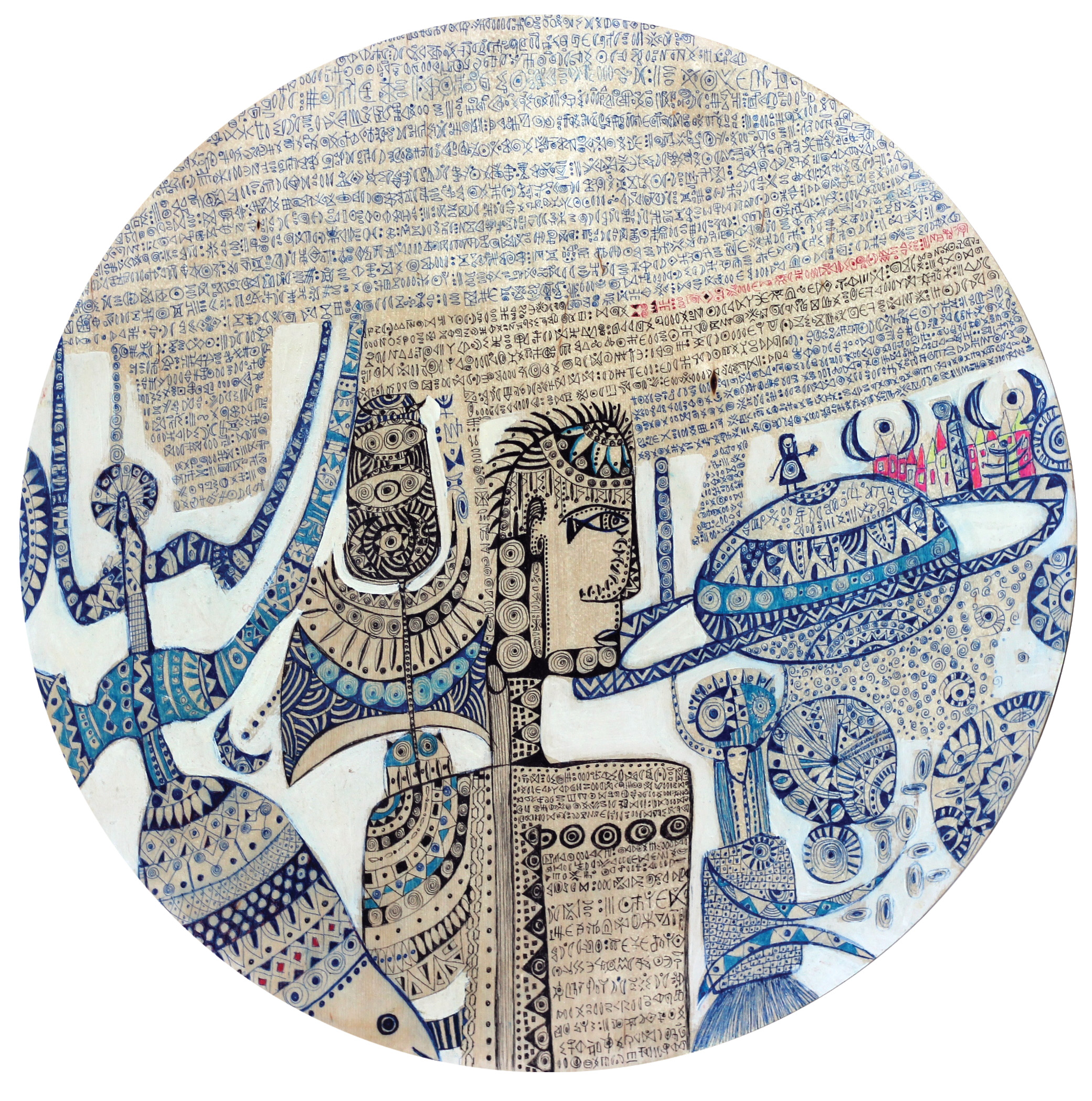 А некоторые работы – это целые письмена. Они сочетаются с рисунками или же выступают самостоятельной завершенной композицией. Носителями загадочных символов являются и изображения людей, тела которых исписаны нерасшифрованными иероглифами. Каждому такому «письму» присущ свой характер и почерк, не повторяющийся в других работах.