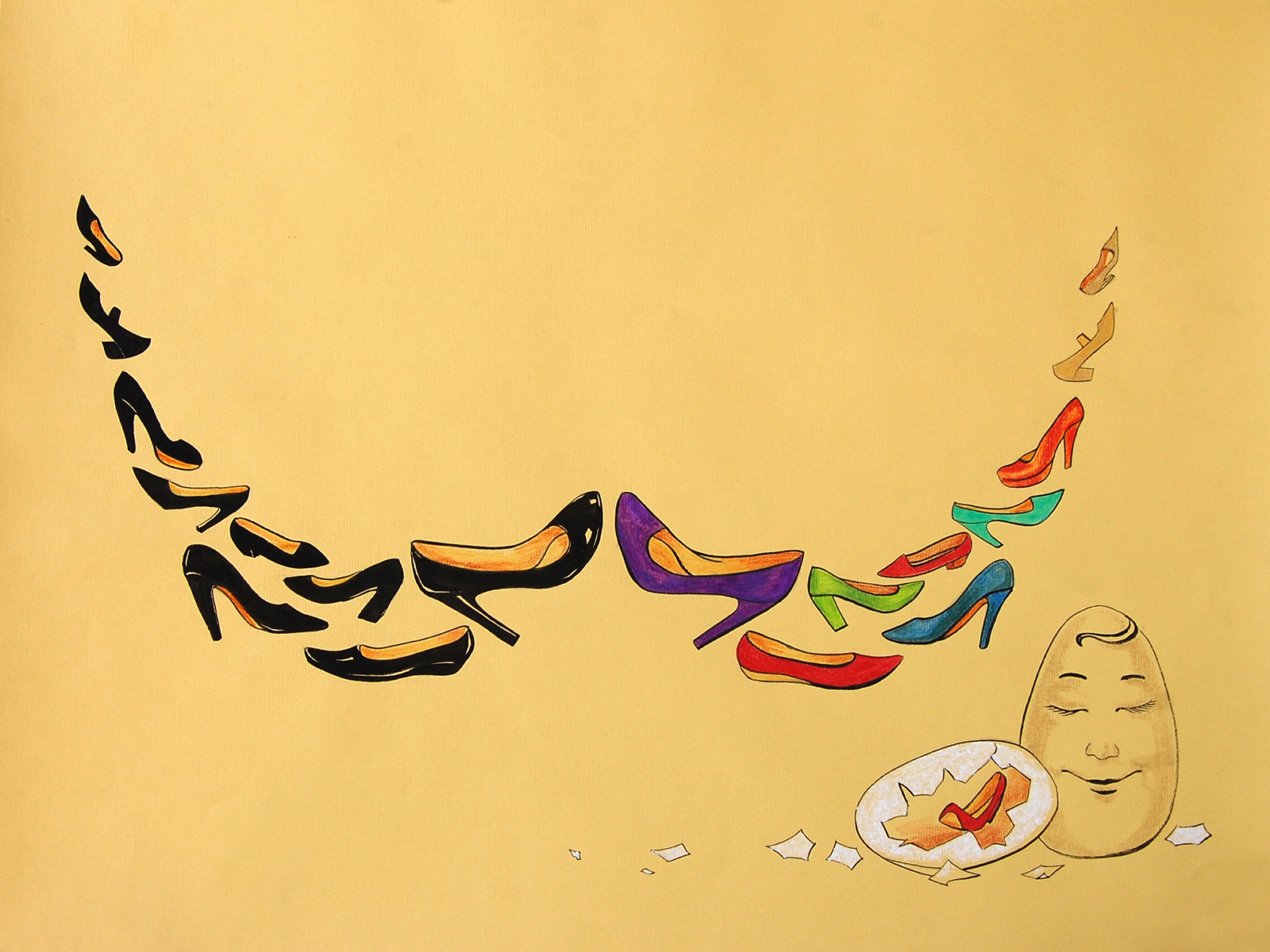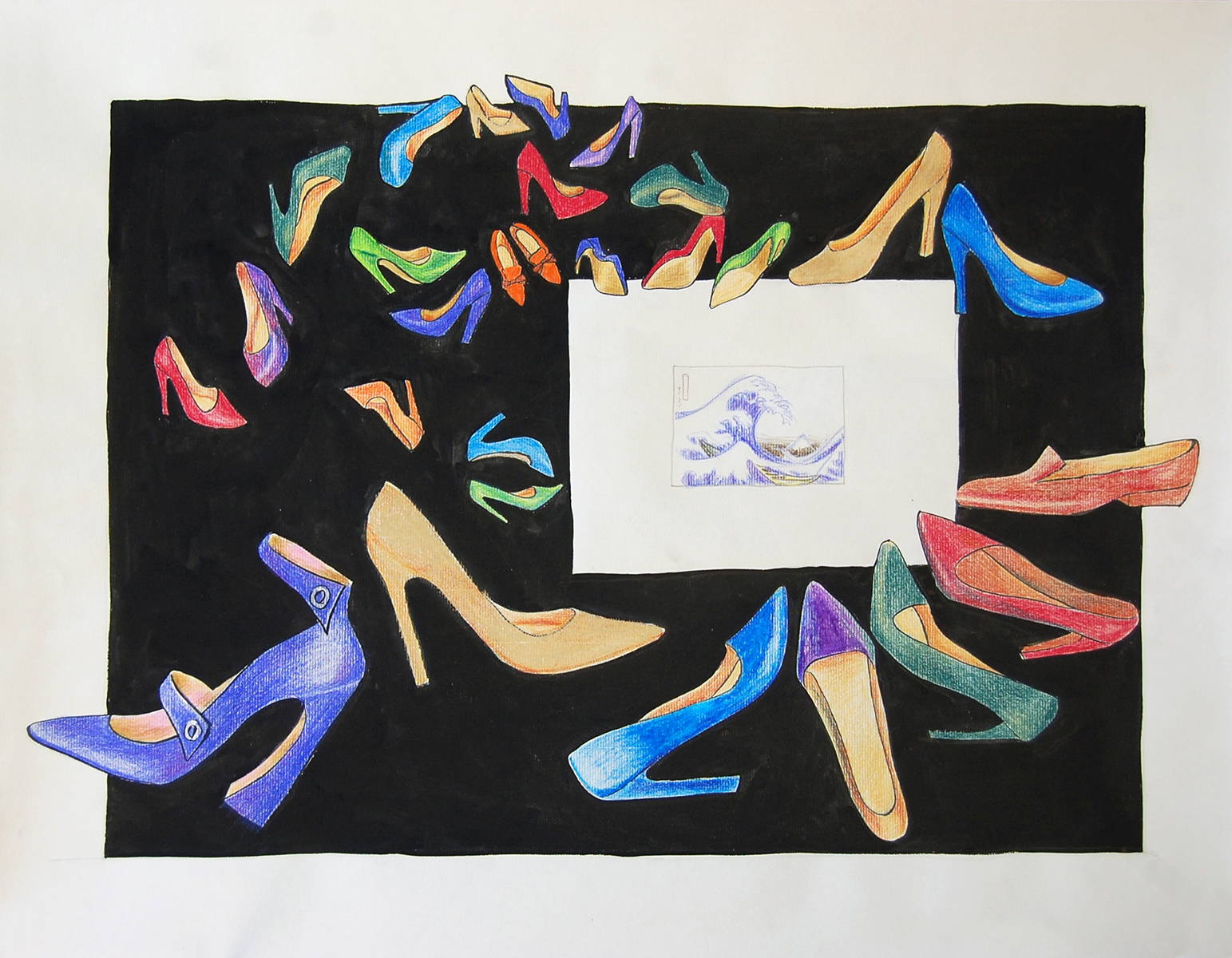 Туфельки на выставке Хокусая. Иллюстрация к авторской сказке «Летающие туфельки». 2011. Бумага, тушь, акрил. 42х60