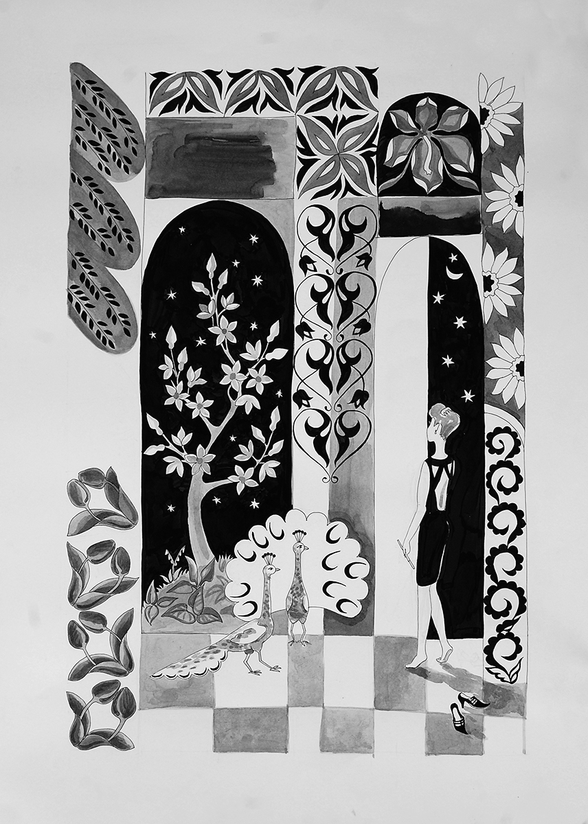Из серии «Orientalglam». Девушка и павлин. 2011. Бумага, тушь. 60х42